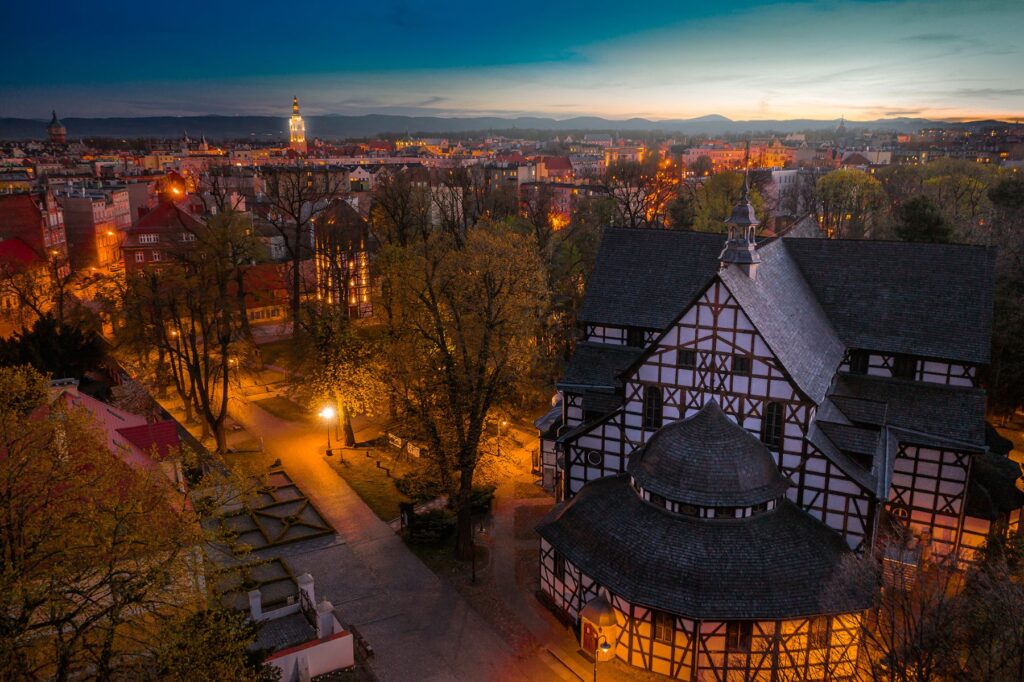 Późnobarokowy, orientowany z południa na północ kościół o wymiarach 30 m długości i 17,5 m szerokości jest jedną z dwóch świątyń wzniesionych w mieście w XVII w. (drugim jest kościół Bonifratrów p.w. Św. Trójcy). Poświęcenie nowego, wybudowanego prawdopodobnie według planów Friedricha Arnolda i Johanna Boumanna Starzego, kościoła odbyło się 27.10.1750 roku. W 1830 roku z okazji 300-lecia Konfesji Augsburskiej kościół został nazwany Dworskim.